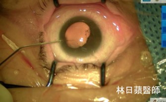 左圖:術中要分開沾黏,肉眼可見幾乎水晶體貼著角膜,難以操作